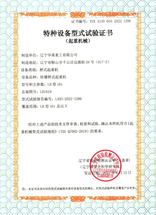 防爆單梁形式試驗合格證